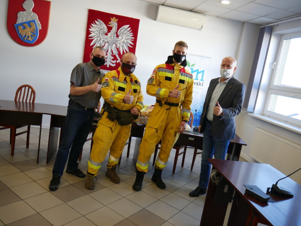 Starosta Mikołowski Mirosław Duży oraz naczelnik Wydziału Zarządzania Bezpieczeństwem Starostwa Powiatowego w Mikołowie Bartłomiej Depta przekazali wczoraj dowódcom orzeskiej „13 Grupy Poszukiwawczo-Ratowniczej Orzesze” ufundowane przez Powiat nowe kombinezony specjalne „Scantex”.