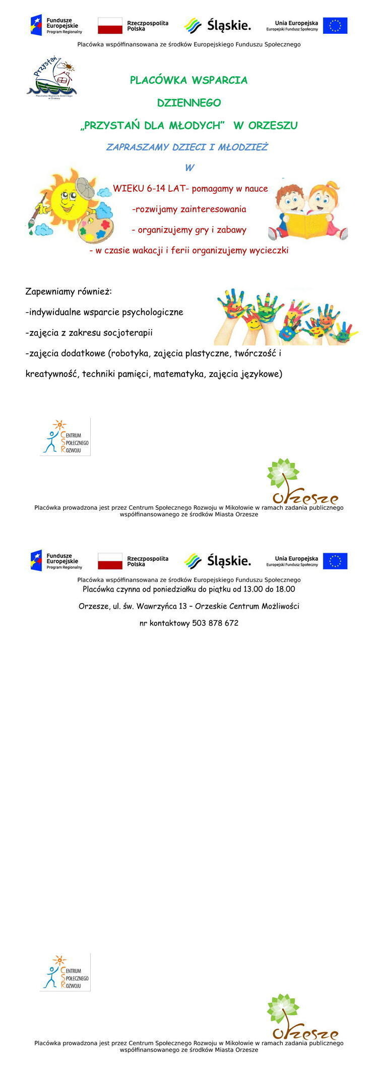 Placówka wsparcia dziennego "Przystań dla młodych" w Orzeszu zaprasza na zajęcia dzieci w wieku od 6 do 14 lat.
