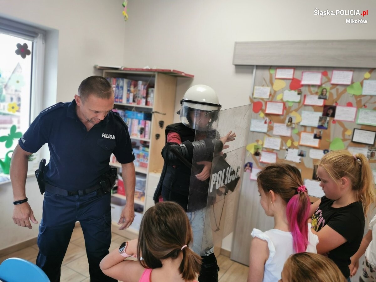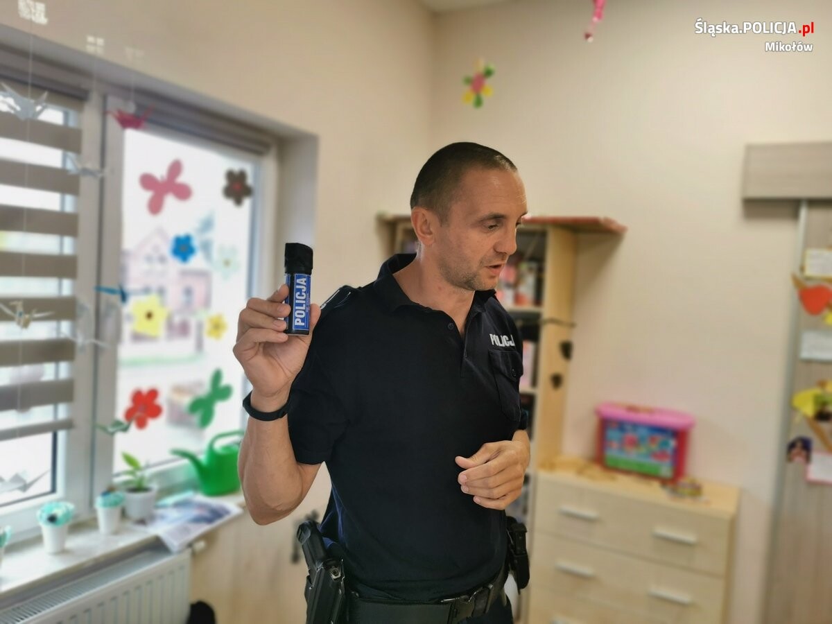 Spotkanie odbyło się dziś rano w orzeskiej placówce przy ulicy św. Wawrzyńca. Grupa podopiecznych wyczekiwała przy w oknach budynku i przywitała aspiranta Cerana z radością. Policjant opowiedział o swojej codziennej służbie oraz zadaniach wykonywanych przez mundurowych w różnych pionach formacji. W międzyczasie przeprowadził też prezentację policyjnego sprzętu, między innymi, sprzętu łączności oraz środków przymusu bezpośredniego. Aktywni i pełni energii młodzi orzeszanie obejrzeli przyniesione gadżety, a później posłuchały uwag na temat bezpieczeństwa podczas letniego wypoczynku. Największa uwaga zwrócona została na reguły korzystania z przejścia dla pieszych i tzw. kultury na drodze. Na koniec spotkania dzieci miały okazję przyjrzeć się z bliska policyjnemu radiowozowi i zapozować do pamiątkowego zdjęcia.