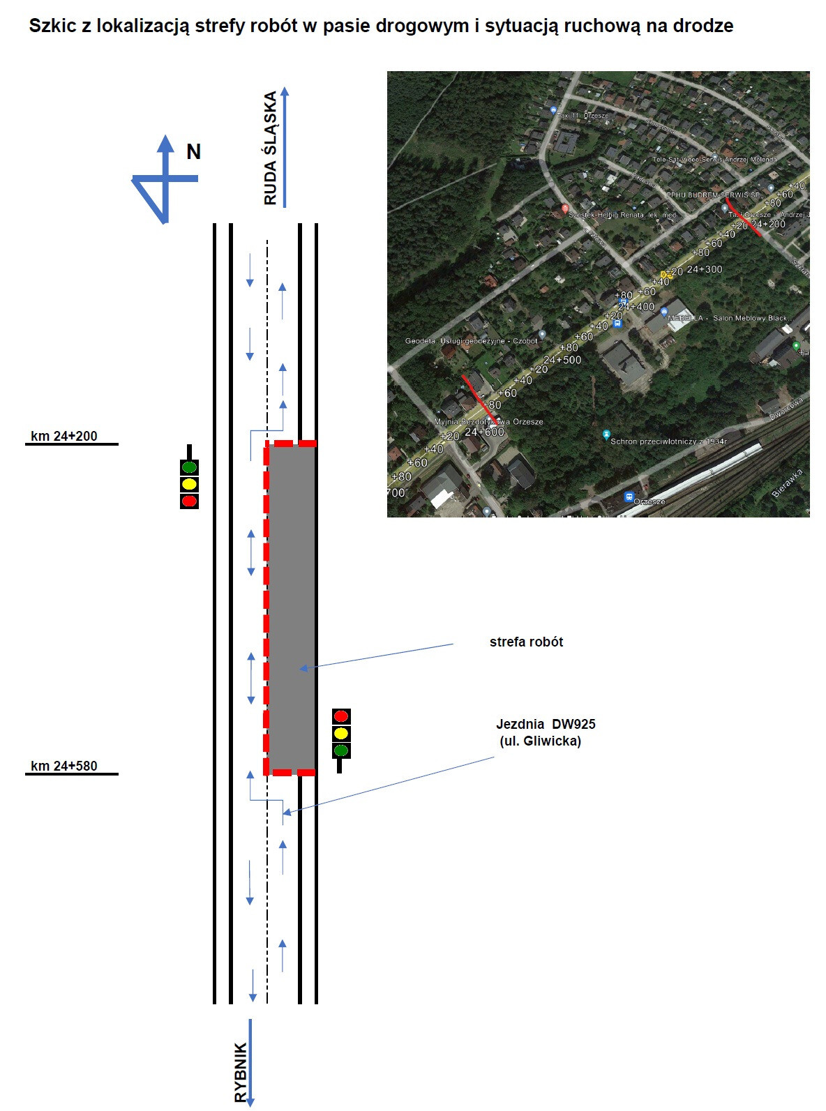 W związku z potrzebą oznakowania strefy robót, planuje się zamknięcie dla ruchu lewego pasa jezdni (na kierunku do Rybnika). Ruch wahadłowy pojazdów sterowany sygnalizacją świetlną będzie się odbywał prawym pasem jezdni (zgodnie z załączonym przez wykonawcę uproszczonym szkicem z lokalizacją strefy robót w pasie drogowym).