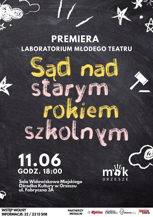 Laboratorium Młodego Teatru działające przy Miejskim Ośrodku Kultury w Orzeszu zaprasza na premierę najnowszego spektaklu pt. „Sąd nad starym rokiem szkolnym”. Wydarzenie odbędzie się 11 czerwca o godzinie 18:00 w Sali Widowiskowej MOK przy ul. Fabrycznej 3A.