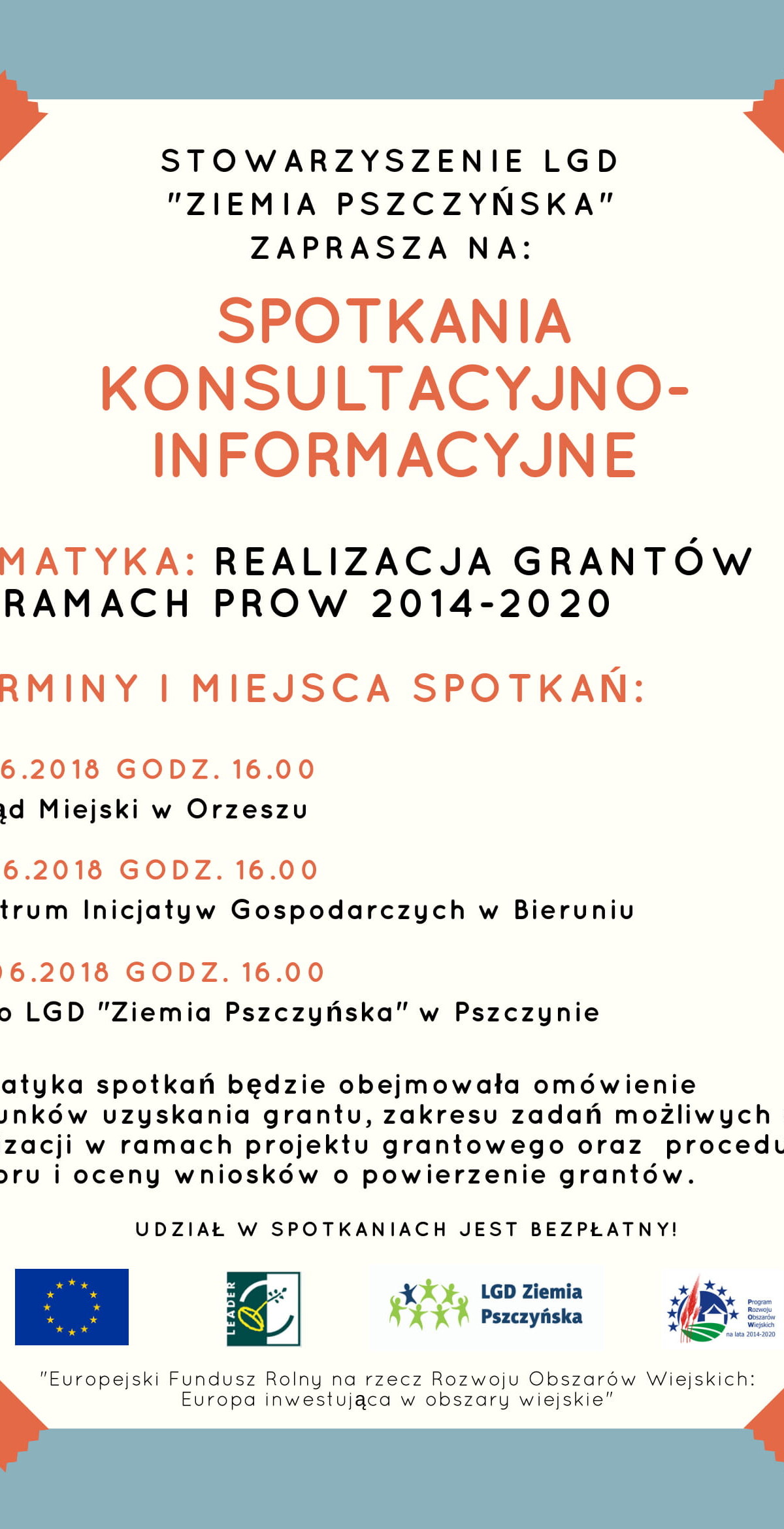 W związku z tym serdecznie zapraszamy potencjalnych Grantobiorców, zwłaszcza mieszkańców i organizacje pozarządowe działające na obszarze objętym LSR na spotkania informacyjno - konsultacyjne dotyczące możliwości aplikowania o środki LGD w tym zakresie.