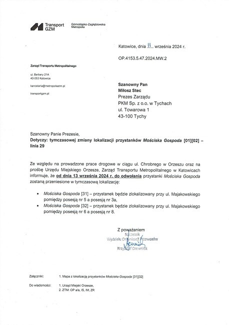Urząd Miejski w Orzeszu informuje, że w związku z pracami drogowymi prowadzonymi na ul. Chrobrego, przystanki linii 29 Mościska Gospoda zostaną przeniesione do nowej, tymczasowej lokalizacji. Zmiana ta wejdzie w życie od 13 września 2024 r. i będzie obowiązywać do odwołania.