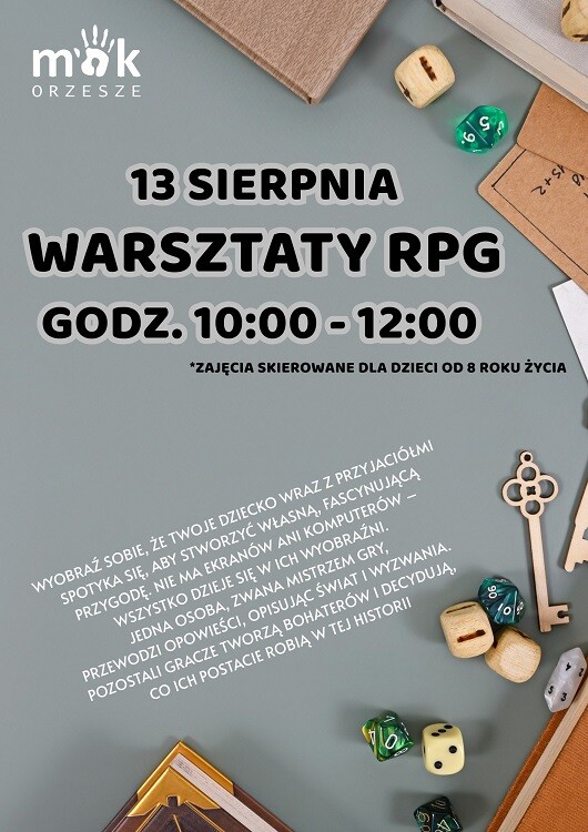 Już 13 sierpnia w Miejskim Ośrodku Kultury w Orzeszu odbędą się wyjątkowe warsztaty RPG dla dzieci od 8. roku życia. To doskonała okazja, by oderwać się od komputera i przeżyć własną przygodę w świecie wyobraźni.