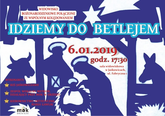 Miejski Ośrodek Kultury serdecznie mieszkańców Orzesza na WIDOWISKO BOŻONARODZENIOWE - "Idziemy do Betlejem" - które odbędzie się w sali MOK w Jaśkowicach, 6 stycznia 2019 r, o godz. 17:30.