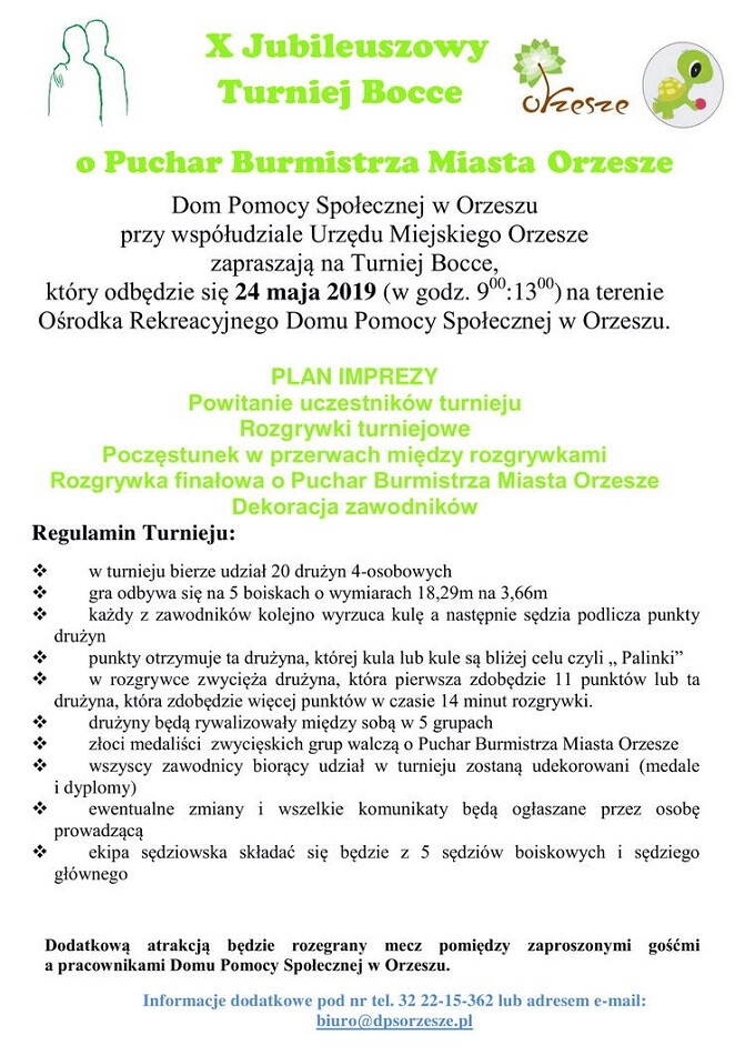 Dom Pomocy Społecznej w Orzeszu przy współudziale Urzędu Miejskiego Orzesze zapraszają na Turniej Bocce, który odbędzie się 24 maja 2019 (w godz. 9.00 - 13.00) na terenie Ośrodka Rekreacyjnego Domu Pomocy Społecznej.