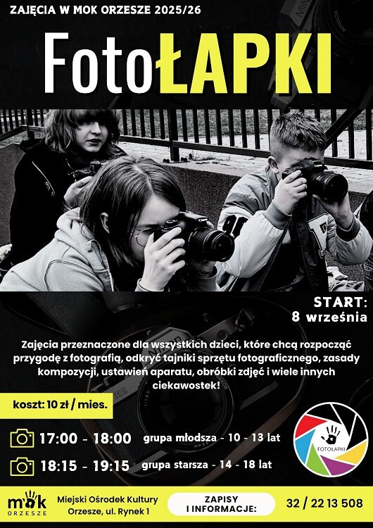 Miejski Ośrodek Kultury w Orzeszu zaprasza dzieci i młodzież do udziału w zajęciach fotograficznych, które rozpoczną się 8 września. Pod nazwą Grupa Fotołapki odbywać się będą spotkania w dwóch grupach wiekowych.
