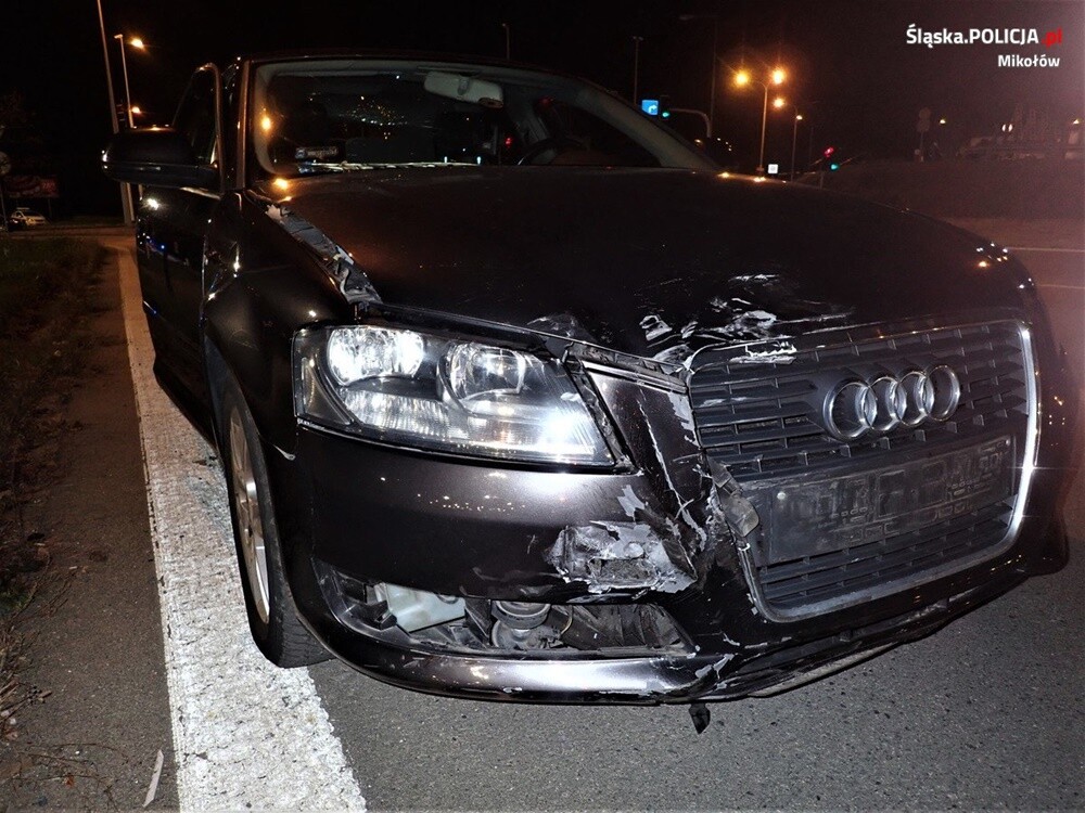 Do zdarzenia doszło w sobotę 15 października około godziny 20.50 w Mikołowie na skrzyżowaniu ulicy Gliwickiej i Narcyzów, tuż przy sklepie budowlanym. Ustalenia policjantów drogówki wskazują, że kierujący audi mieszkaniec Tychów, jadąc w kierunku centrum miasta, wjechał na skrzyżowanie na czerwonym świetle i z dużą siłą uderzył w prawidłowo jadącego volkswagena, którym podróżował 29-letni orzeszanin. Poszkodowany trafił do szpitala, gdzie stwierdzono obrażenia kręgosłupa. Uczestnicy wypadku byli trzeźwi.