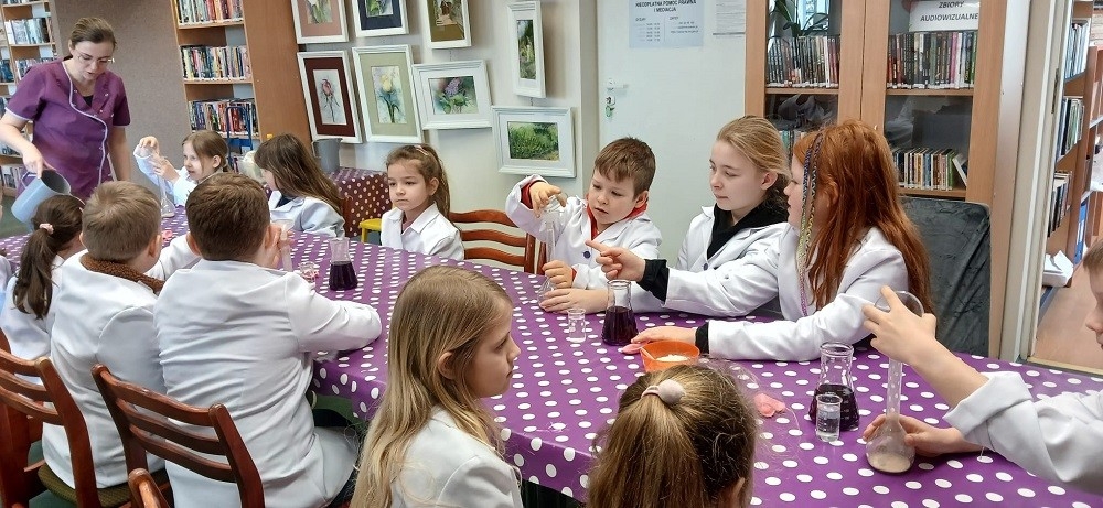 Drugi dzień ferii to prawdziwa przygoda naukowa! Dzieci uczestniczyły w warsztatach biologiczno-chemicznych, podczas których samodzielnie wykonywały eksperymenty. Powstały też piękne żółwie, a uczestnicy bawili się w kalambury, rozwijając wyobraźnię i zdolności aktorskie. Oczywiście nie zabrakło kolejnego wspólnego czytania.