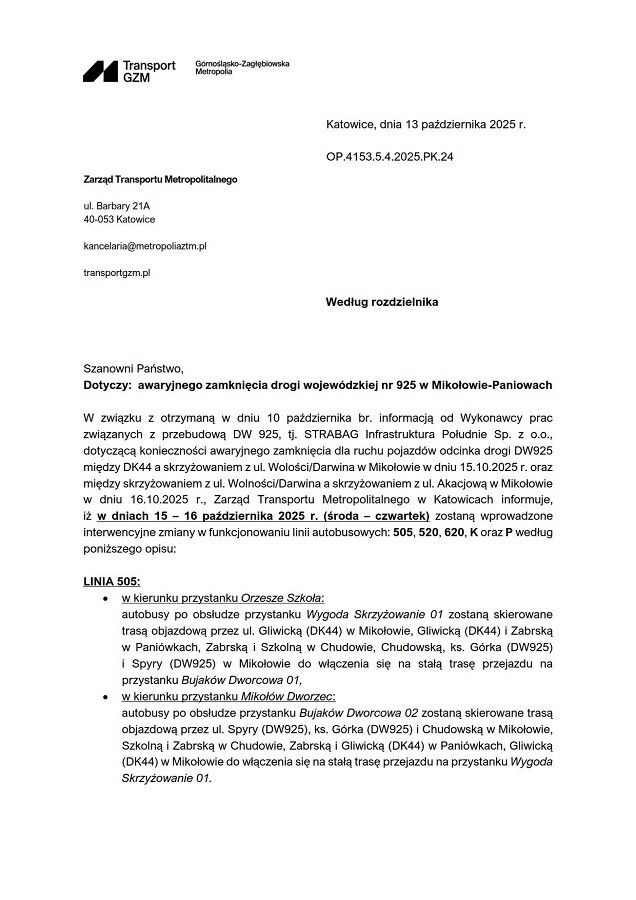 Jak informuje Zarząd Transportu Metropolitalnego w Katowicach, w dniach 15 i 16 października (środa–czwartek) zostanie awaryjnie zamknięty odcinek drogi wojewódzkiej nr 925 w Mikołowie-Paniowach.