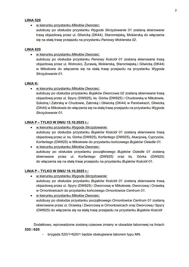 W kierunku Mikołów Dworzec – po obsłudze przystanku Bujaków Dworcowa 02, autobusy pojadą przez Spyry, ks. Górka, Chudowską w Mikołowie, dalej Szkolną i Zabrską w Chudowie, a następnie Gliwicką (DK44) w Paniówkach i Mikołowie, wracając na stałą trasę przy przystanku Wygoda Skrzyżowanie 01.