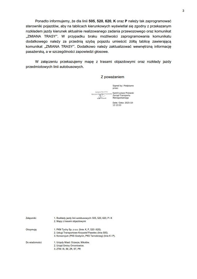 W związku z zamknięciem drogi, autobusy linii 505 zostaną skierowane trasą objazdową, co może wpłynąć na czas przejazdu i punktualność kursów.