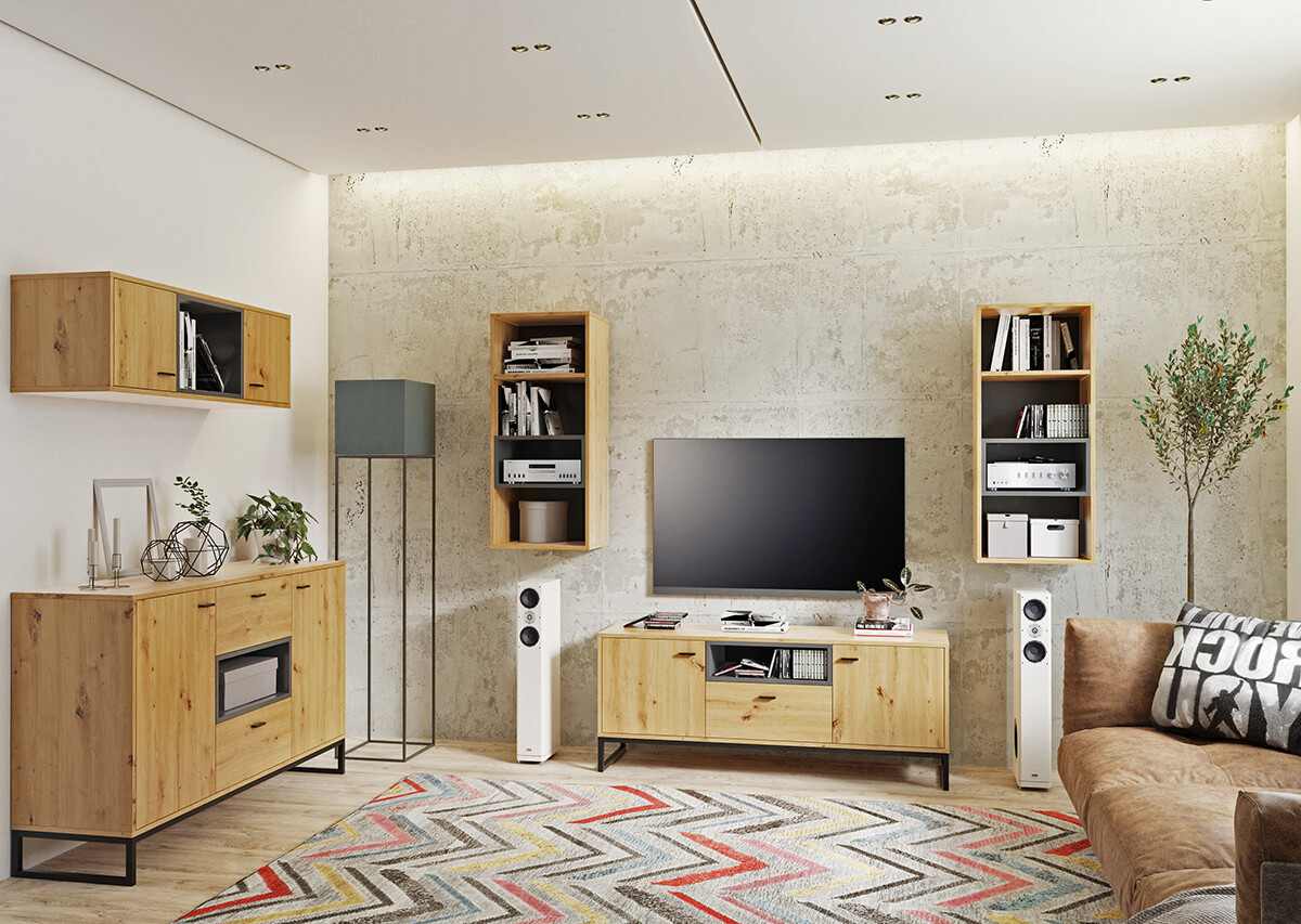 W ofercie e-sklepu Mebline.pl znaleźć można komody wykonane z drewna, solidnej płyty meblowej, a także z metalu oraz innych materiałów. Przykładem może być nowoczesna komoda do salonu OLIER w kolorze dębu Artisan. Posiada metalowe nóżki o industrialnym zacięciu oraz czarne wstawki, które dodają komodzie charakteru. Mebel wyposażono w funkcję cichego domyku. Idealnie wpasuje się w nowoczesny wystrój wnętrza zainspirowany stylem loftowym. Można na nim postawić designerską lampę lub roślinę w doniczce. W kolekcji OLIER znajdziesz ponadto praktyczne biurko, kufer, ławę kawową, regał, szafę, witrynę z przeszkleniem oraz inne elementy.